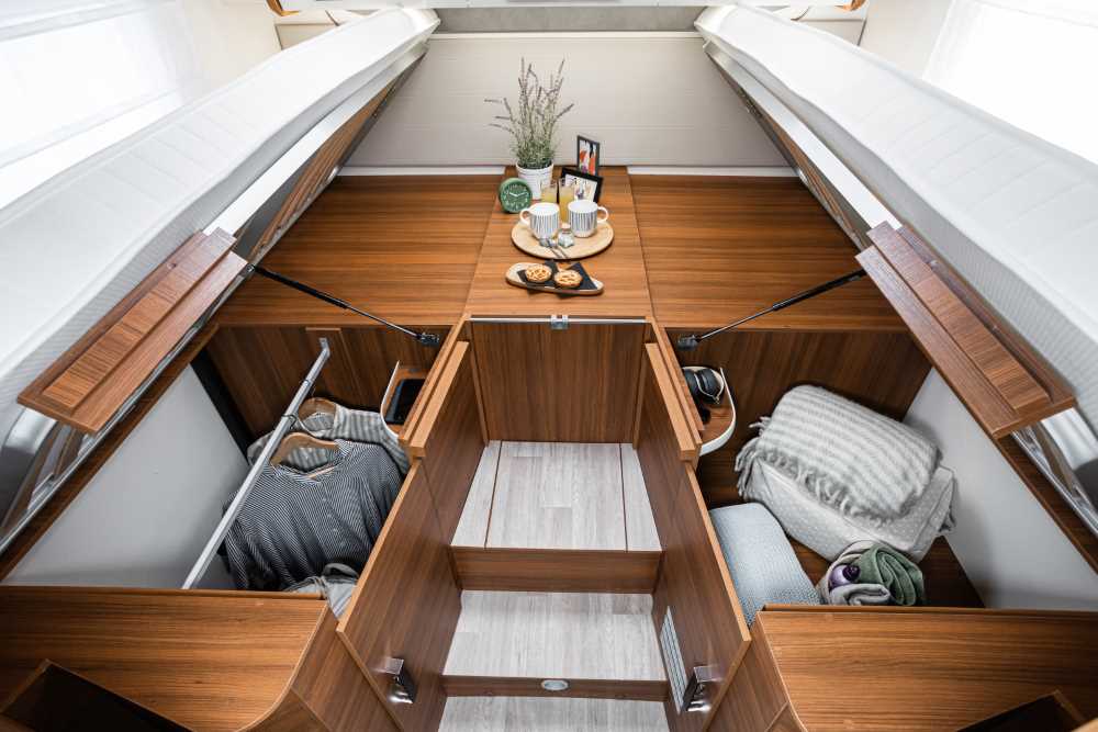 De populaire indeling met lengtebedden en ruime garage is er in 2 lengtes: de Elnagh Baron 573 meet 7,45 meter en voor wie compacter wil is er de Elnagh Baron 565 van 6,99 meter.